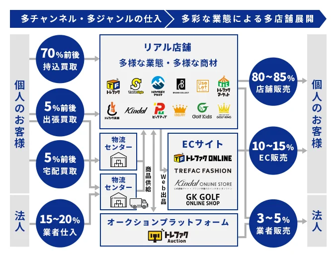 当社のビジネスモデルの基本は、多様な商品を仕入れ、多様な業態にて販売すること。これを仕入・販売チャネルの拡充と商材流通網の整備により、実現しています。