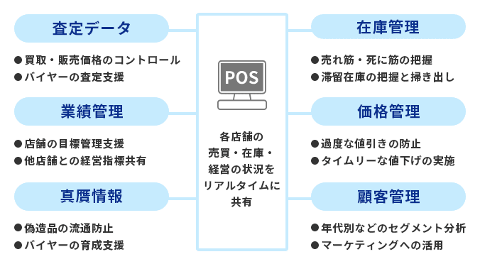 リユース業は一点ものを扱うため属人的なビジネスだと思われがちですが、トレジャー・ファクトリーでは、独自開発のPOSシステムを中心に、全ての情報を内製の仕組みで管理しており、それらのデータを活用した経営体制が確立されています。